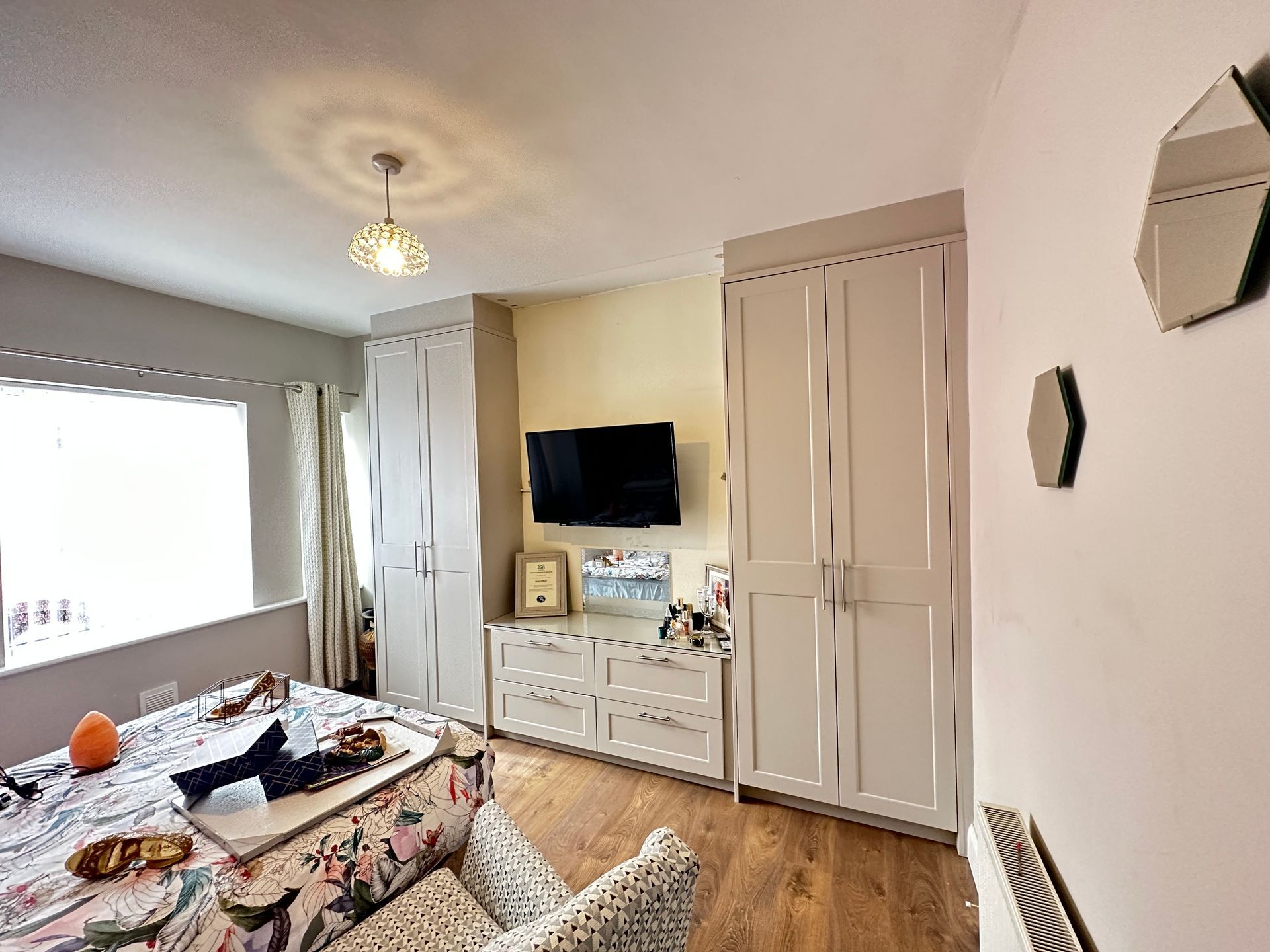 No matter the size of your space, our skilled designers will create a bespoke storage solution that fits flawlessly. Each piece is meticulously crafted to scribe to walls and skirting, ensuring a perfect fit and maximizing the use of every inch. Our goal is to create stunning and functional fitted bedroom furniture that not only meets your storage needs but also enhances the overall aesthetics of your space.